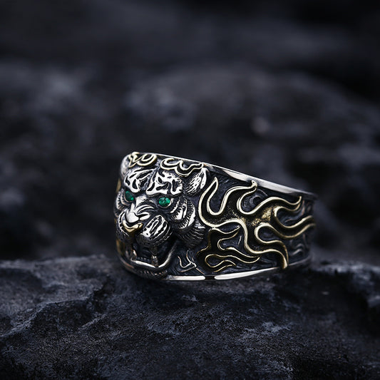 925 Sterling Silver Tiger Head Retro Adjustable Ring